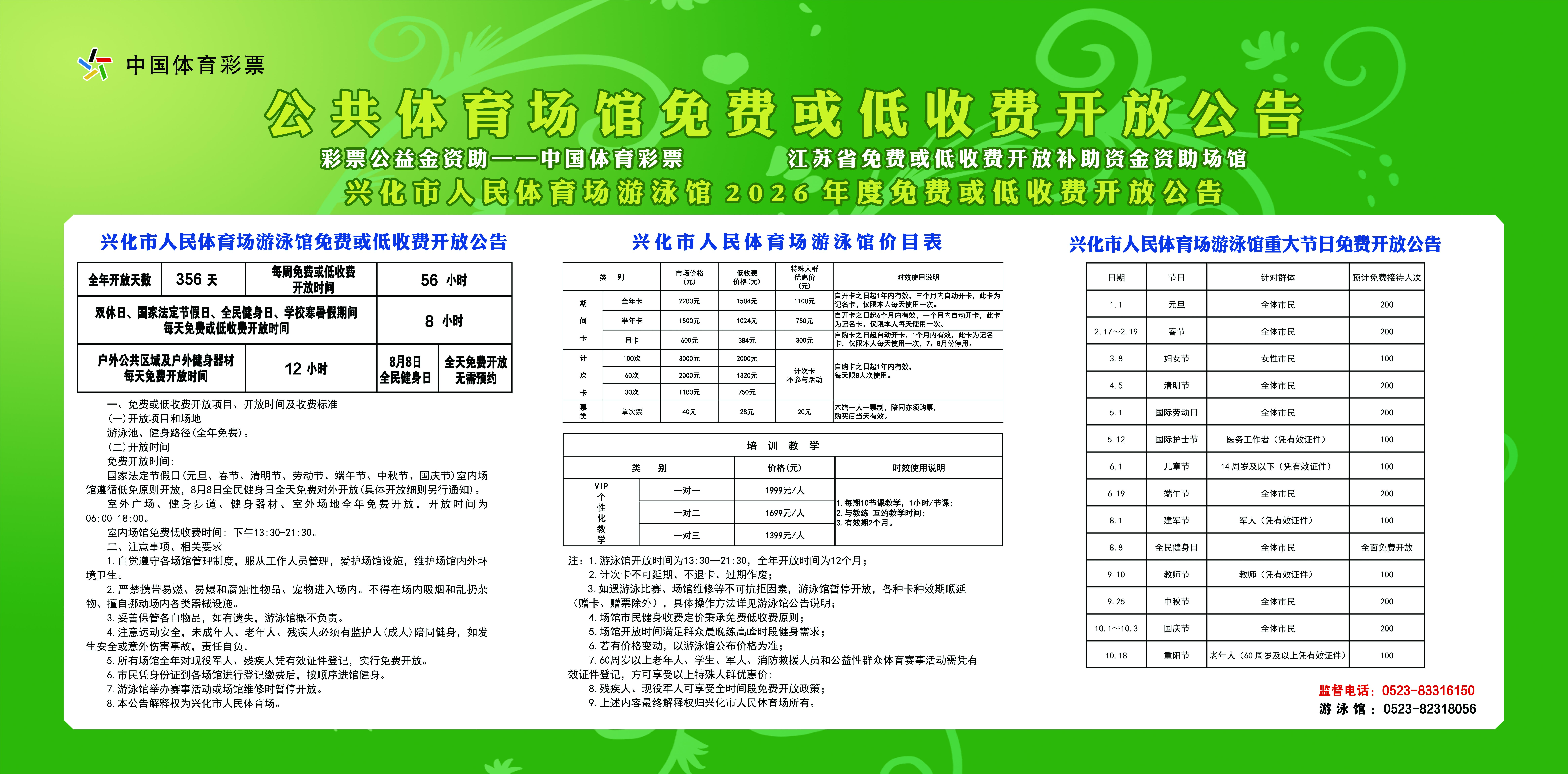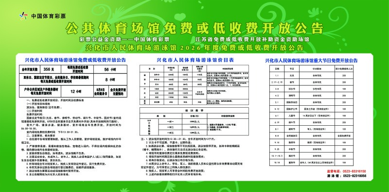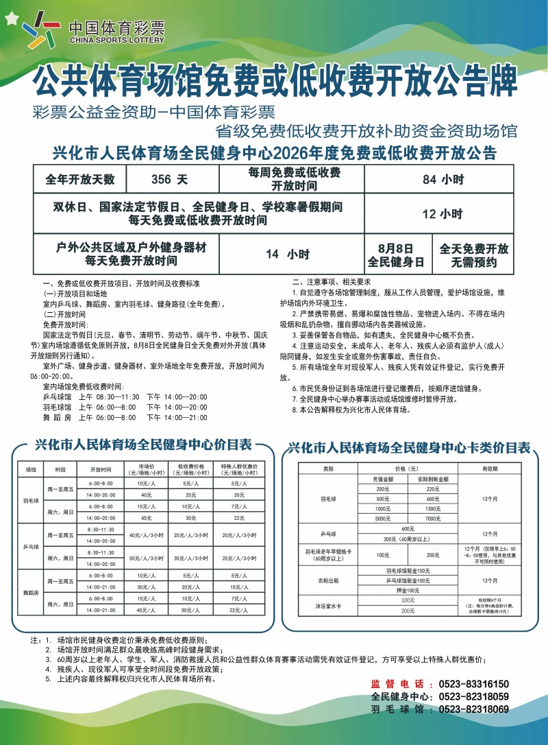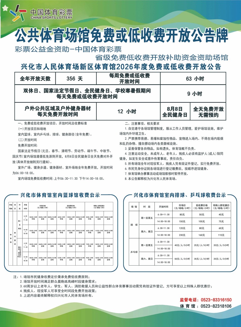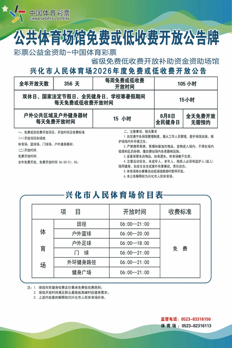 兴化市人民体育场2026年度免费或低收费开放公告
