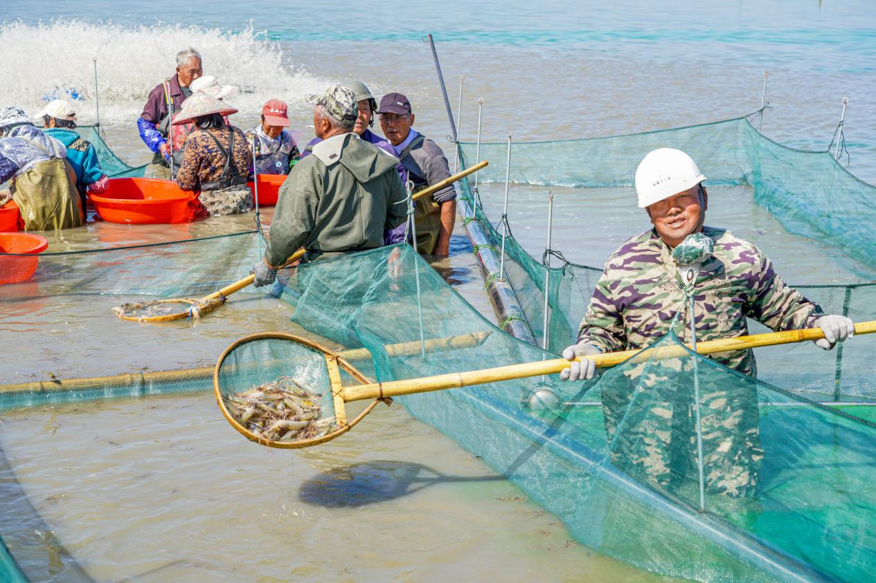 随着渔网逐渐收紧,一只只晶莹剔透、体态饱满、个头硕大的罗氏沼虾跃出水面,在渔网中活蹦乱跳。虾农们娴熟地捞出鲜虾,装入塑料盆中,经过分拣后,放入网箱,过秤称重后装车,一车车运往上海、杭州等地。