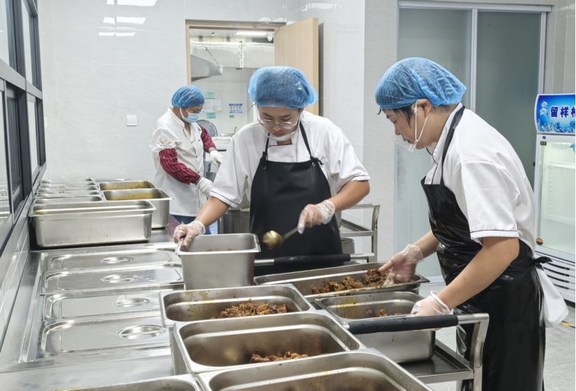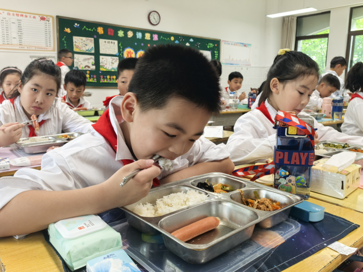 在文峰小学,11点20分,打包好的饭菜被装入移动小推车送到各班级的门前,在老师的有序引导下,学生开始有序拿餐。食堂特意为同学们准备了丰富的菜肴,同学们吃得津津有味。据了解,孩子们的食谱是由专业营养师根据学生生长发育需求设计,包含了优质蛋白质、丰富维生素及适量碳水化合物,确保了每一份餐食都能满足学生日常所需的能量与营养。