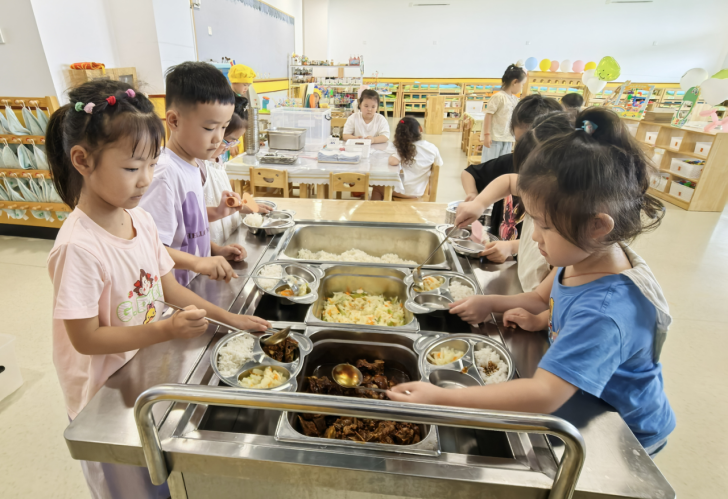 为了让学生每一餐都吃得安心、舒心,文峰幼儿园还对食堂的设施布局、食品的采购储存、烹饪加工等过程做好严格监督,保证菜品质量。同时,为培养幼儿良好的独立进餐习惯,文峰幼儿园突破了传统意义上由教师分餐、幼儿等待的进餐方式,转而采取了幼儿自主进餐的形式,利用幼儿园配备的取餐工具,让孩子们学习自主取餐。