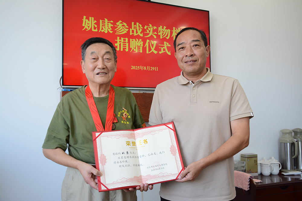 8月29日上午,兴化市退役军人事务局的大厅里,80岁的退役老兵姚康将自己保存的20件珍贵史料悉数捐赠给兴化市党史方志办公室。