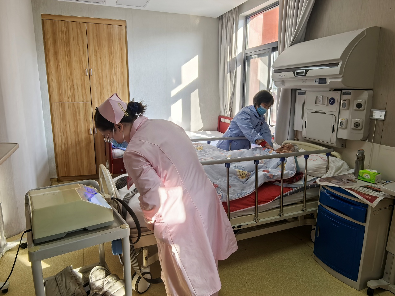 在兴化市城北社区卫生服务中心,护工正借助床位护栏为老人翻身,专业医护人员细心查看老人最新的身体状况。“有了专门床位,护理效率提高不少。”护士长王素萍向记者介绍,“同时新增床位的老人如有就医需求可以直接转型,免除转病区病床等程序。”据了解,此次新增床位主要面向慢性病管理、失能失智及需要长期专业护理的困难老年人,不仅提供基础生活照料,更能实现及时医疗干预,有效缓解了家庭照护的人力与经济压力,让老人获得有尊严、有质量的晚年生活。