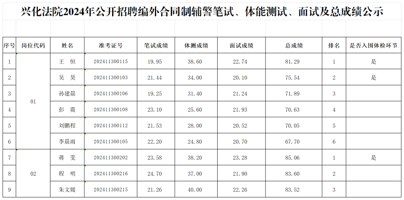 兴化法院2024年公开招聘编外合同制辅警笔试、体能测试、面试及总成绩公示
