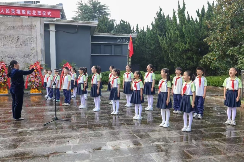 上午8时,敬献花篮仪式正式开始。10名礼兵迈着铿锵有力的步伐,正步行进到广场两侧伫立。全场齐声高唱中华人民共和国国歌,雄壮的旋律、嘹亮的歌声,在千秋广场上空久久回荡。国歌唱毕,全场肃立,向人民英雄默哀。默哀毕,少先队员献唱《我们是共产主义接班人》,并致少年先锋队队礼。随着深情的《献花曲》旋律响起,陈锋剑缓步上前,仔细整理花篮缎带,表达对革命烈士最崇高的敬意。