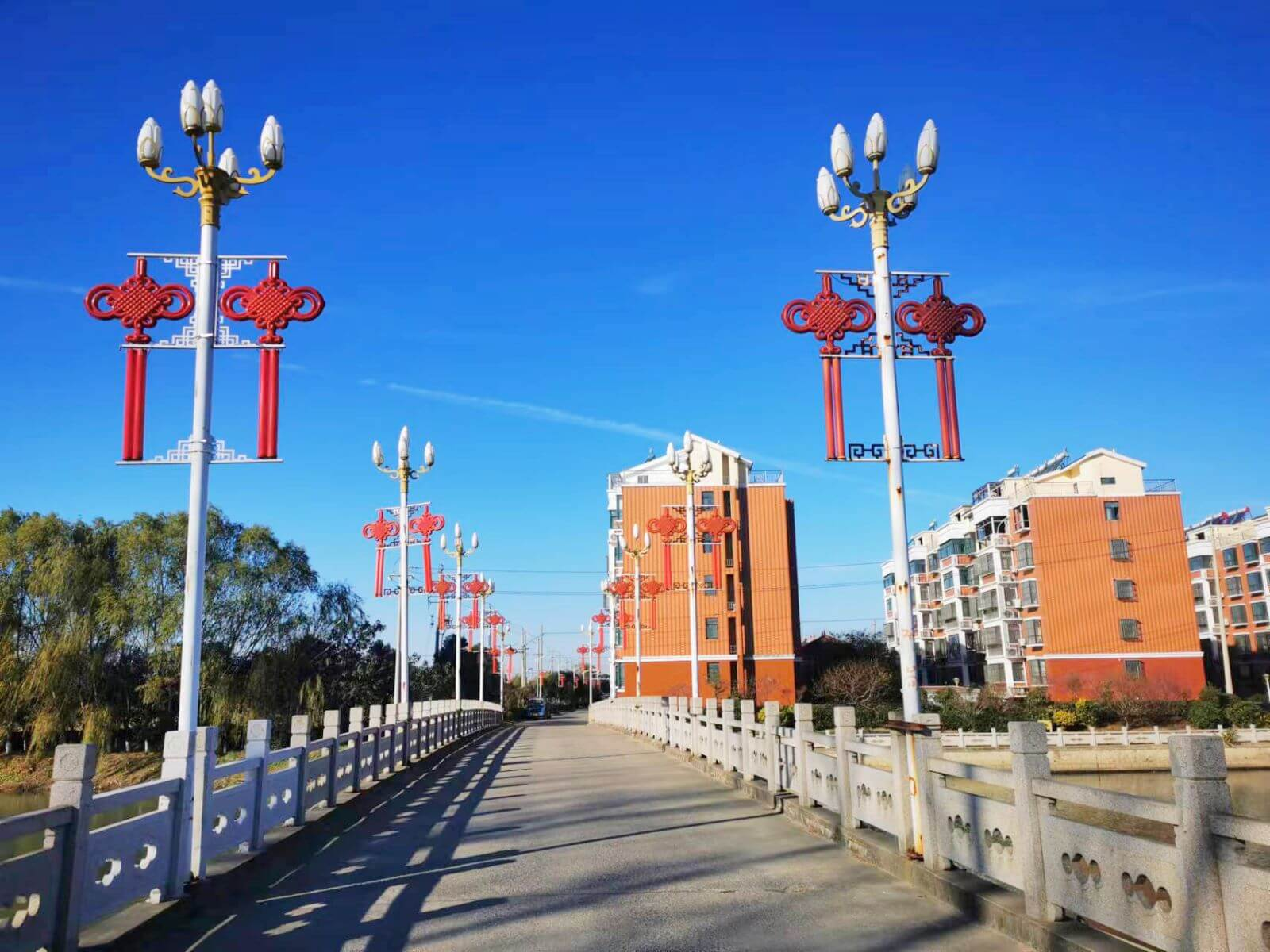 走过通往该村的盐靖河大桥,排排绿树,伫立在宽阔平坦的乡村大道旁;那高高悬挂在小桥两侧红红的中国结路灯,在春阳下分外耀眼。杭正林说,村里原先的200多盏路灯使用年代久远,晚上像萤火虫一样一闪一闪地。村里全部换成了LED路灯,其中42盏是红红的中国结路灯,每到夜晚让人感觉“疑是银河落罗顾”。