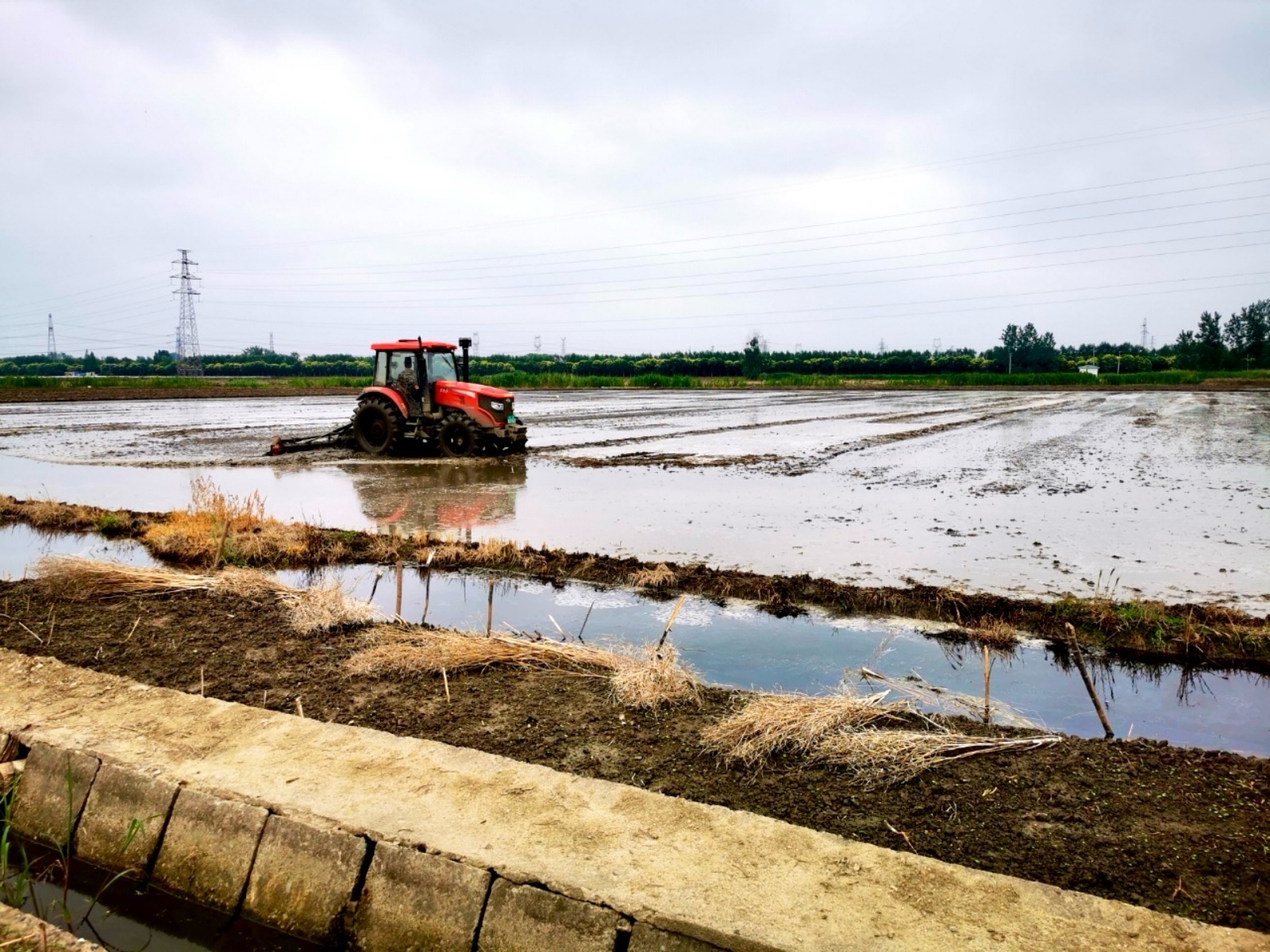 不远处,一台中型拖拉机牵引着“耙箱”在田垄间作业,高效地将水面浮草压入泥中并平整田面。农场现场管理人吉萍小介绍:“过去人工整田费时费力,现在机械‘嵌草整田’效率倍增,为后续机插打下坚实基础。”面对农场分散的300余亩田块和紧张的农时,机械化已成为“刚需”。