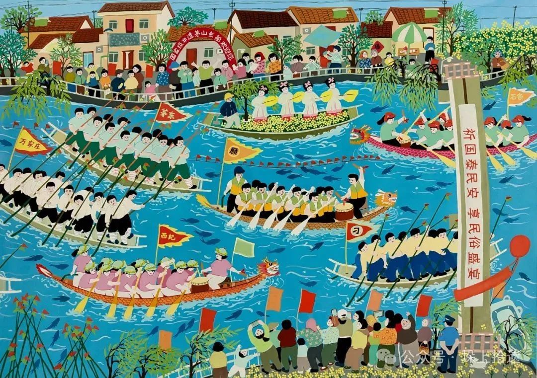 在色彩运用上,作品以明快鲜艳的色调为主,蓝色描绘出水乡的灵动与秀美,船只和人物服饰则以红、黄等亮色点缀,渲染出欢快热烈的节日气氛。这些色彩不仅具有强烈的视觉冲击力,更象征着生活的丰富多彩,表达了人们对美好生活的向往。同时,画作通过色彩和场景,传递出祈求国泰民安、团结奋进的精神内涵,承载着敬仰生命、团结乡邻的文化价值。