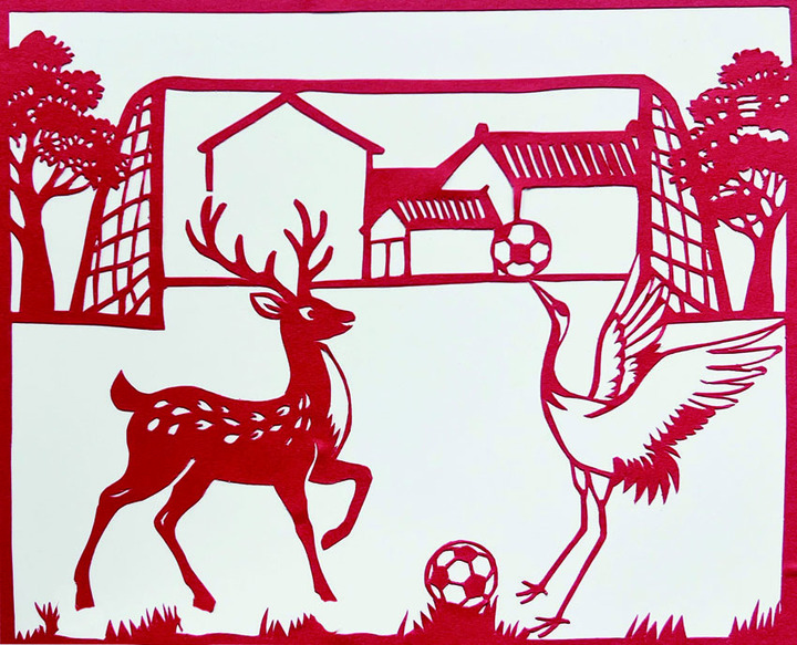 在这幅剪纸作品中,“麋鹿”与“白鹤”摇身变成绿茵场上的足球健将,“麋鹿”欲突破防守抬脚射门,“白鹤”则振翅顶球作势进攻。传统的大红纸上,流畅的线条勾勒出栩栩如生的动态场景,虚实相生的构图手法让整幅作品既保留剪纸艺术的古朴韵味,又充满体育竞技的动感活力。