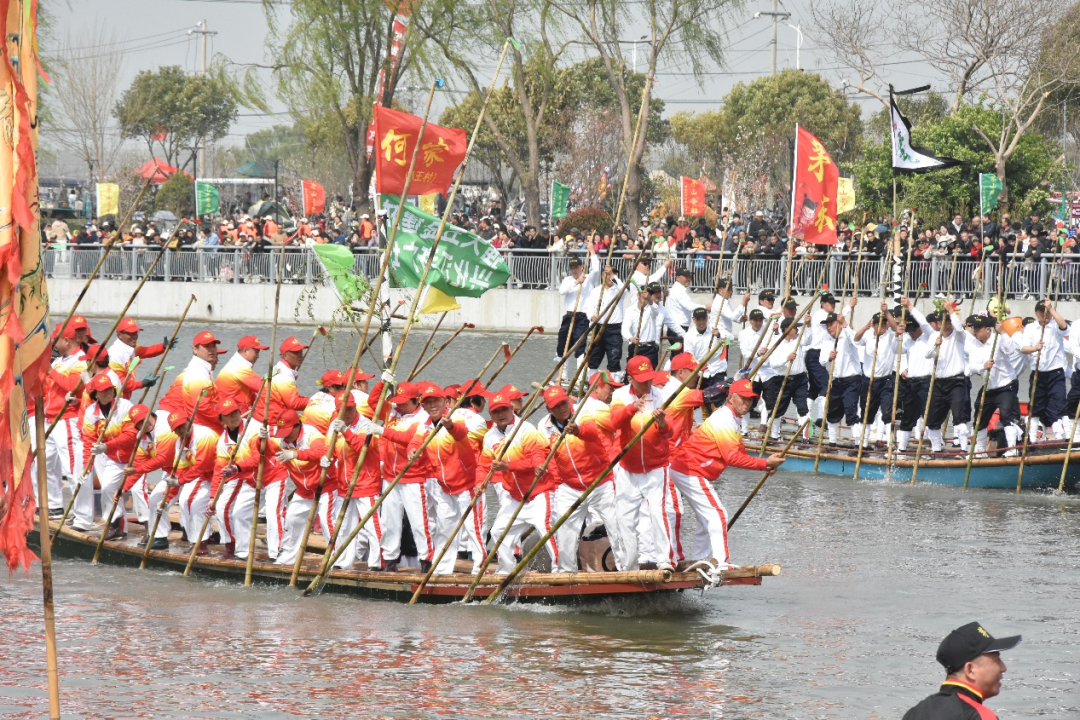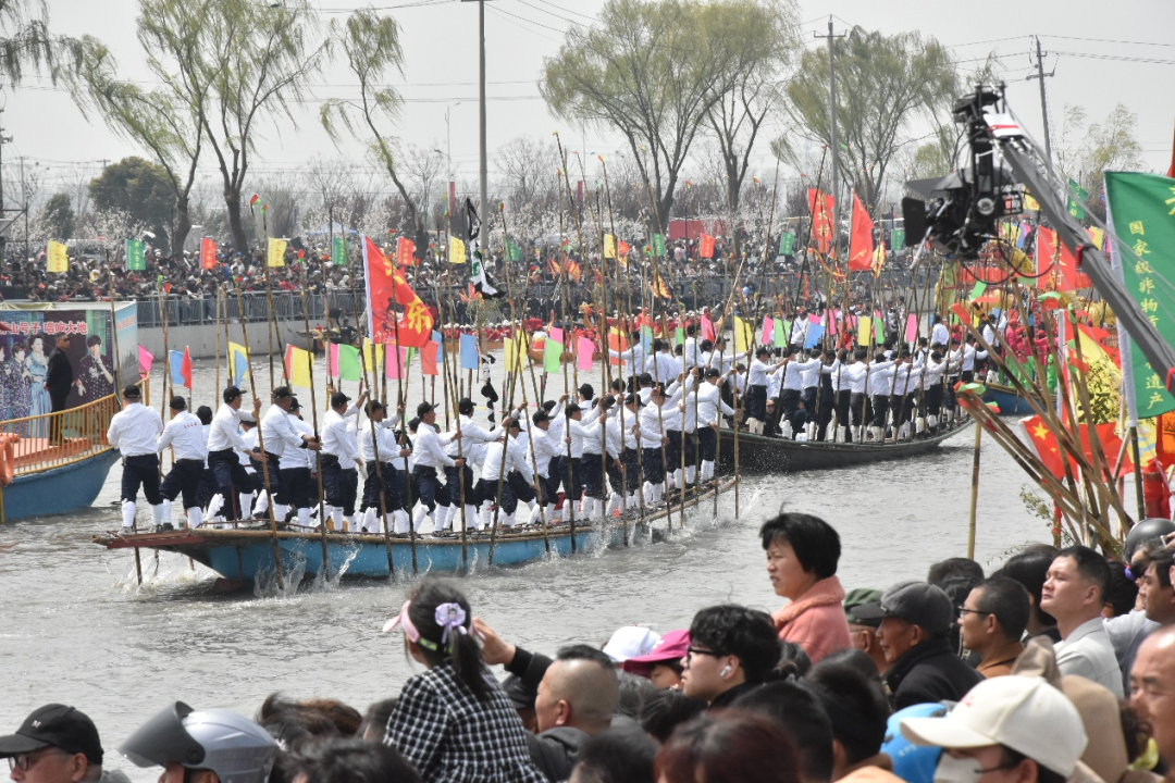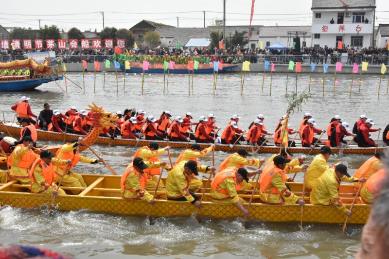 4月4日上午,戴南镇近300条会船、龙舟云集在茅山村、刁良村宽阔的水面上,举行一年一度的会船盛会,参赛选手近万人,观赛游客6万多人,岸上济济一堂,船头彩旗猎猎。这场延续800年的水上歌行,此刻正承载着民族记忆,以全新的姿态与时代脉搏共振。