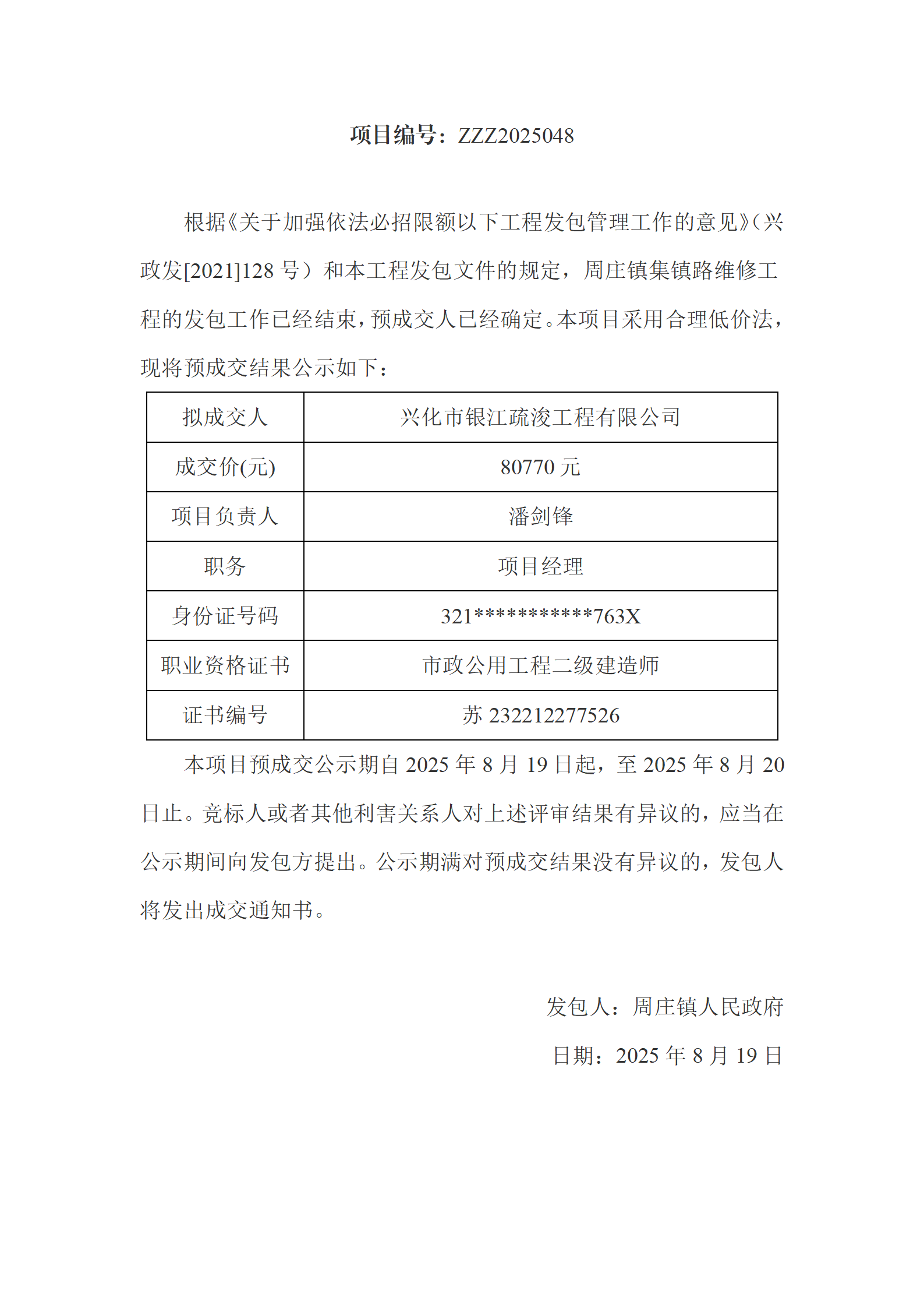 周庄镇集镇路维修工程预成交公示
