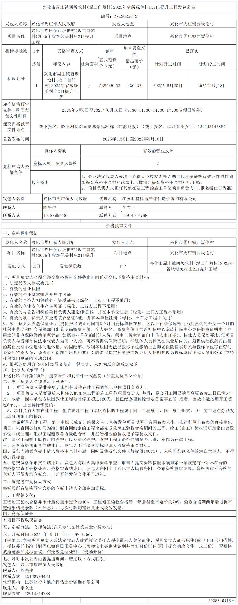 兴化市周庄镇西坂伦村(坂二自然村)2025年省级绿美村庄211提升工程发包公告