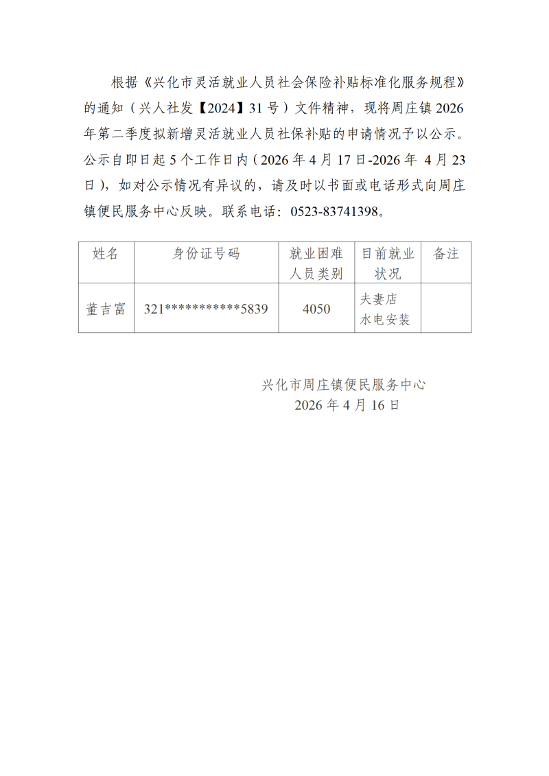 周庄镇拟新增灵活就业人员社保补贴申请情况公示