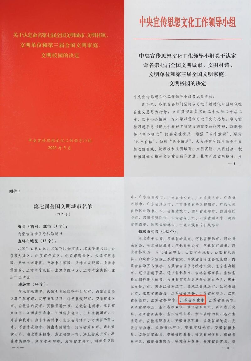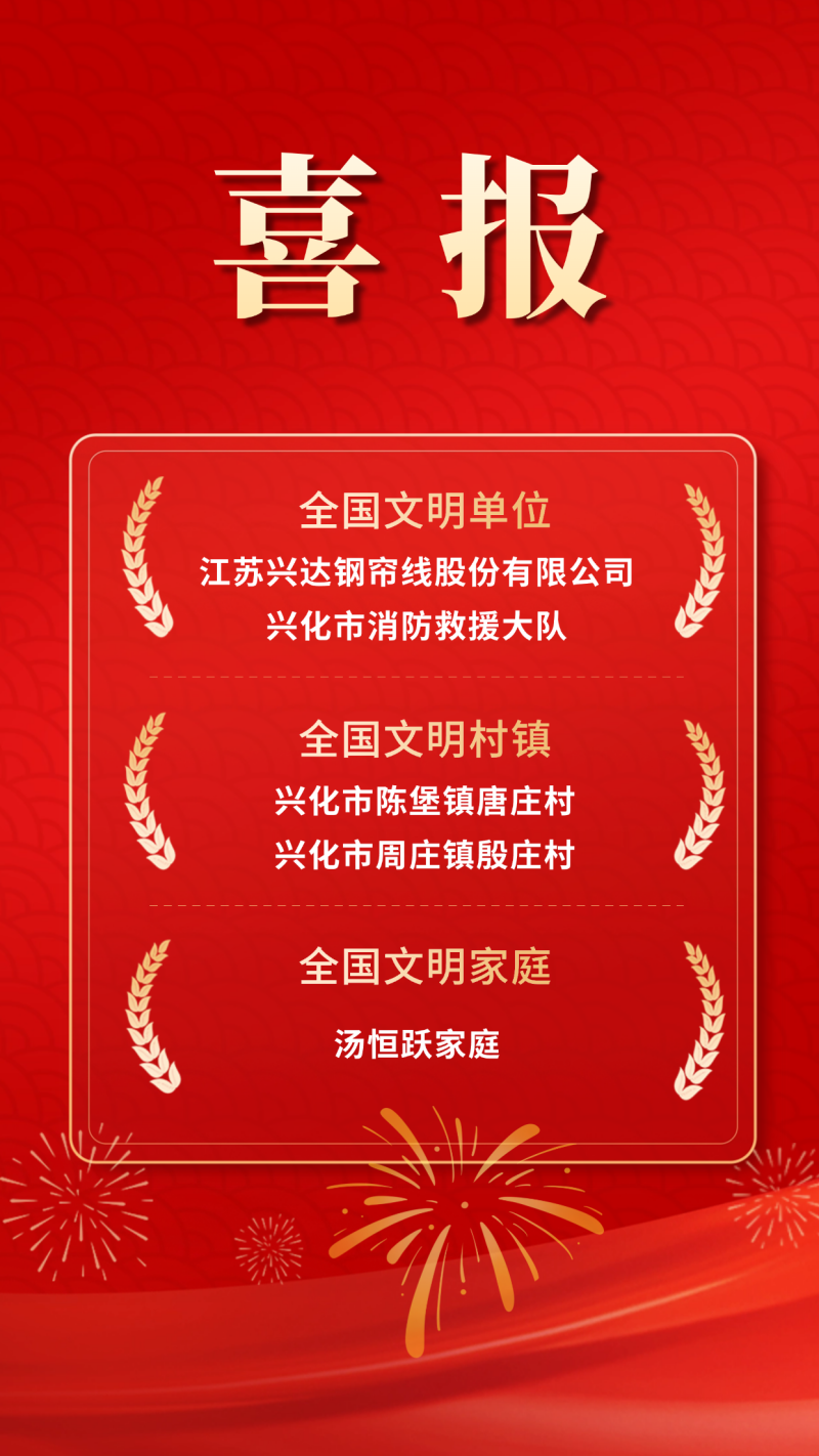 江苏兴达钢帘线股份有限公司、兴化市消防救援大队被评为第七届全国文明单位。这是我市首次获得此类荣誉。